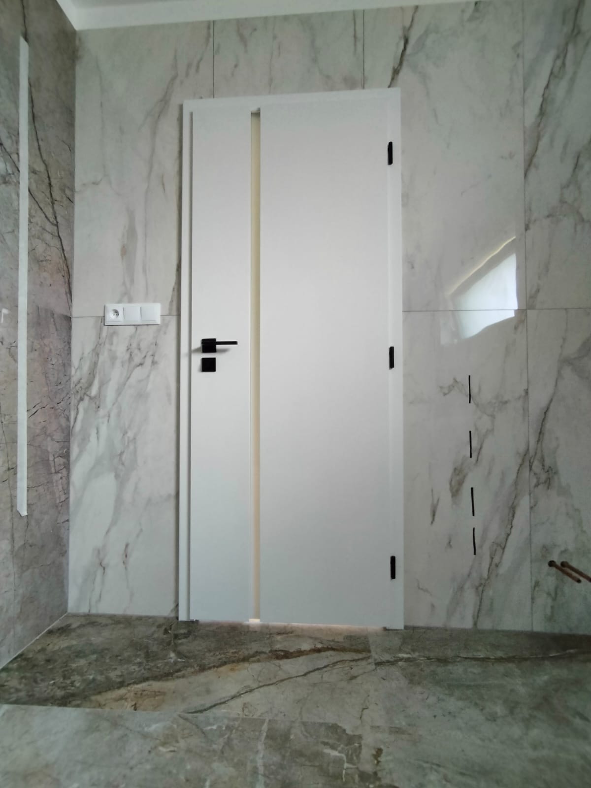 Součástí této realizace byly dveře jak s bílým mléčným sklem, tak se šedým sklem, které v prostoru vytváří elegantní, čistý a mírně kontrastní vizuální efekt.