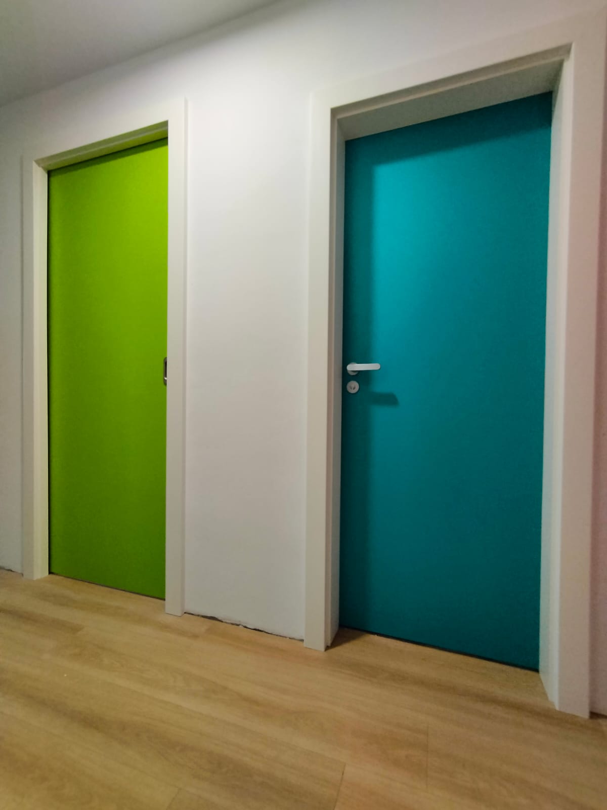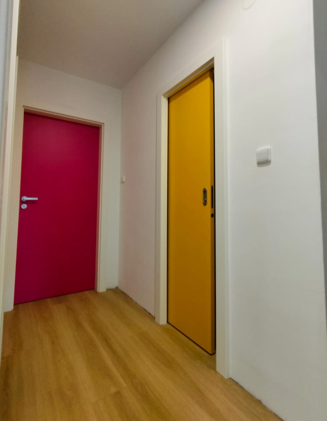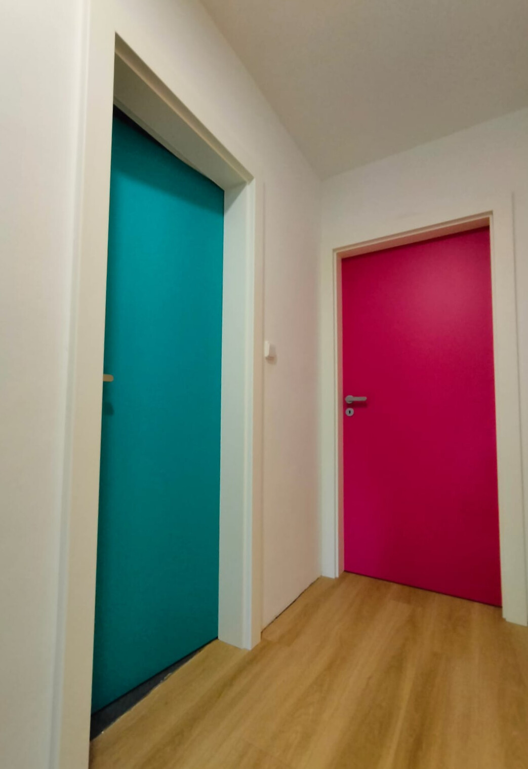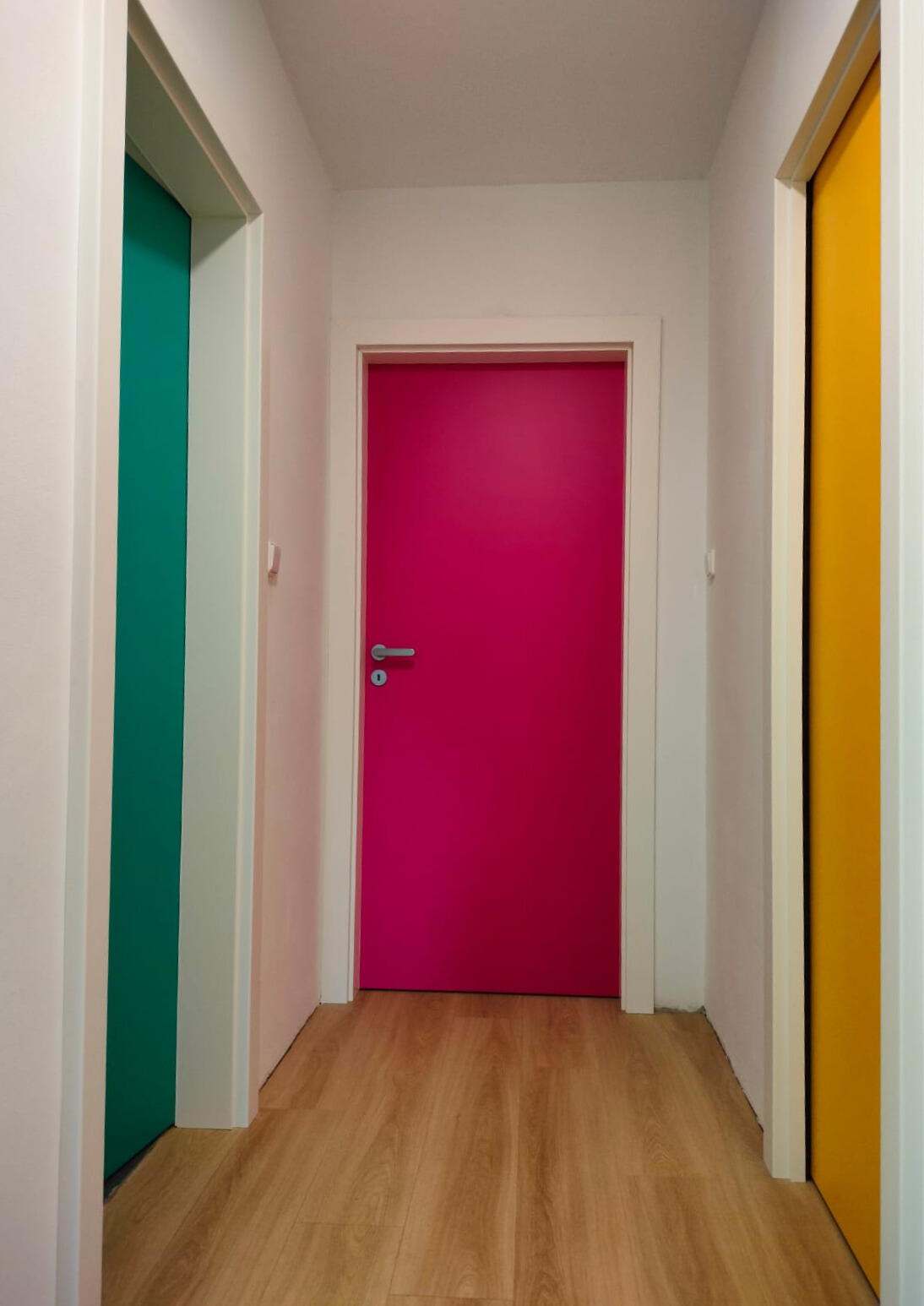 V rámci této realizace pro zákazníka v Brně-Soběšicích jsme instalovali interiérové dveře v nástřiku dle vzorníku RAL, přičemž každá místnost získala svůj vlastní barevný odstín. Výsledkem je výrazný, moderní a hravý interiér, který působí svěže a originálně díky kontrastu mezi bílými zárubněmi a sytými barvami dveří.